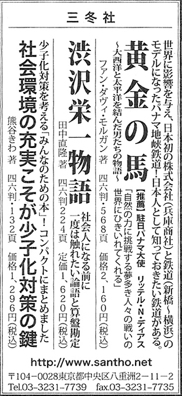 「黄金の馬 パナマ地峡鉄道 〜大西洋と太平洋を結んだ男たちの物語〜」、「渋沢栄一物語」、「社会環境の充実こそが少子化対策の鍵」が京都新聞に掲載されました。 ※右の画像をクリックすると拡大画像がご覧いただけます。