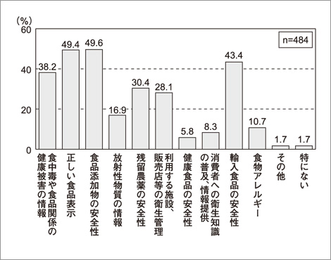食品による健康リスクの認識/食の安全・安心に関する意識調査(堺市)/食の安全・安心に関する意識調査(秋田県)/食において重視すること/食品表示調査/食品の無添加等表示に関する店舗調査/加工食品に対する安全性/ファストフードの安全性/化学調味料に対する意識/食の安全・安心に関する意識調査(人工甘味料)/植物工場の野菜のイメージと消費行動/食の安全の判断基準/世界の遺伝子組換え農作物栽培状況/水の安全意識/食品への異物混入/食品の苦情/家庭のキッチンでの衛生管理/食品・食肉の安全性/食の安全についての主婦の意識/食品・添加物等の実態調査 2014・2015年/消費者の意識/有機農業に関する意識/野菜の栽培に関する意識/機能性表示食品制度に関する認識